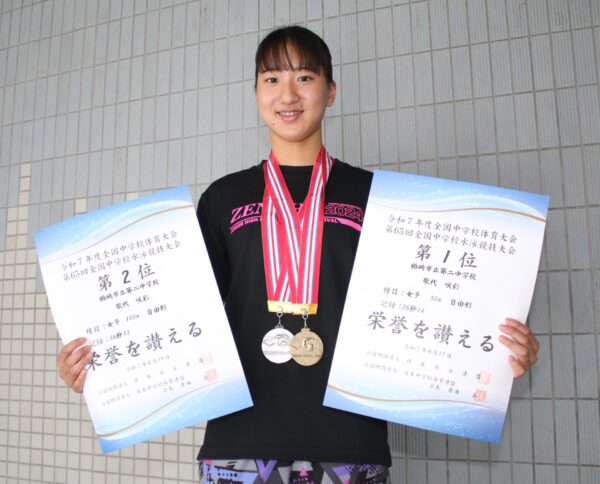 全国中学校体育大会(全中)の水泳競技が鹿児島市鴨池公園プールで行われ、柏崎市立第二中3年・歌代咲彩さんが女子50m自由形で頂点に立った。柏崎勢の全中水泳での優勝は2021年の小山風香さん(柏崎翔洋出、法政大1年)以来。100m同でも自己ベストを更新して準優勝し、「全国の舞台でライバルと戦えるまで成長でき、今までで一番楽しい大会だった」と充実感をにじませた。