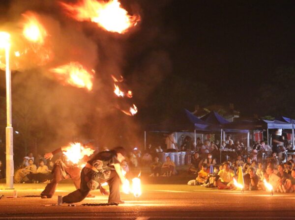石油発祥の地、柏崎市西山の歴史を伝える「草生水(くそうず)まつり」(実行委員会主催)が23日、西山町坂田の西山ふるさと公苑を主会場に開かれ、大勢の観客でにぎわった。石油で栄えた西山の歴史絵巻が古式ゆかしく再現され、来場者を魅了。ステージではダンスやよさこいが披露され、キッチンカーや売店も並び、まつりを盛り上げた。