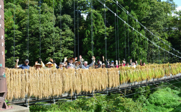 柏崎市高柳町高尾の温泉宿泊施設「じょんのび村」にプレミアムインバウンド(訪日観光)ツアーの一行が訪れ、日本で唯一の体験、吊(つ)り橋に刈り取った稲穂の「はさがけ」をするなど里山ならではの魅力を満喫した。一行はほかにも、同地域に伝わる伝統工芸「門出和紙」のクラフト、餅つきなどを体験し、日本文化を存分に味わった。