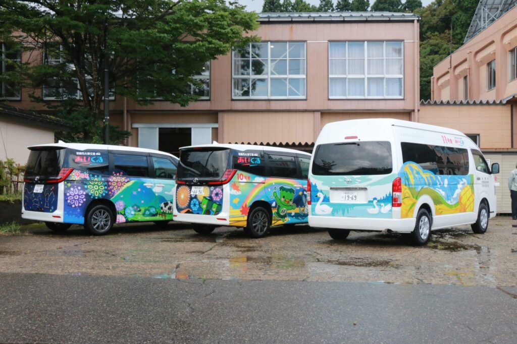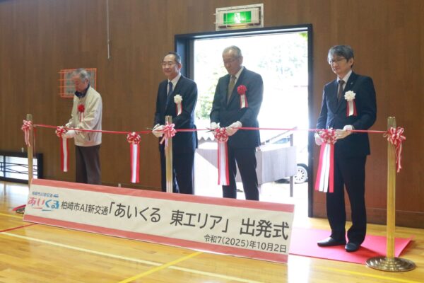 柏崎市のAI新交通「あいくる」が10月から、北エリア(西山、二田、南部、高浜地区全域、中通地区一部)と、東エリア(北条、中鯖石地区全域)でも運行が始まった。各エリア内での乗降のほか、中央エリアの柏崎総合医療センターまで直行利用が可能。各運行初日となった1日には西山町事務所前で、2日は北条コミセン前で出発式が行われた。新たにラッピングされた運行車両もお披露目された。