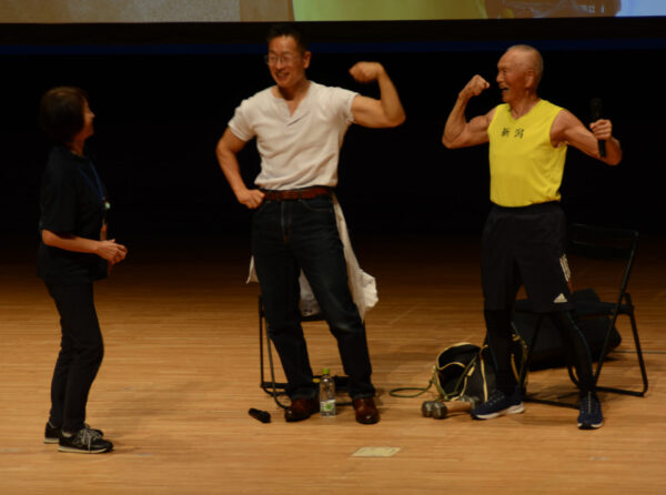 「コツコツ貯筋体操まつり」(柏崎市、高齢者運動サポーター協議会主催、同実行委員会主管)が10日、柏崎文化会館アルフォーレで開かれた。「笑って、楽しく、筋力アップ」をテーマに、NHKテレビ番組「みんなで筋肉体操」でおなじみの谷本道哉さんの実技を交えた講演があり、約500人が和やかに楽しんだ。ゲストのマスターズ陸上重量投げ世界記録保持者の柏崎市笠島、黒崎弘明さん(92)の元気ぶりに圧倒された。