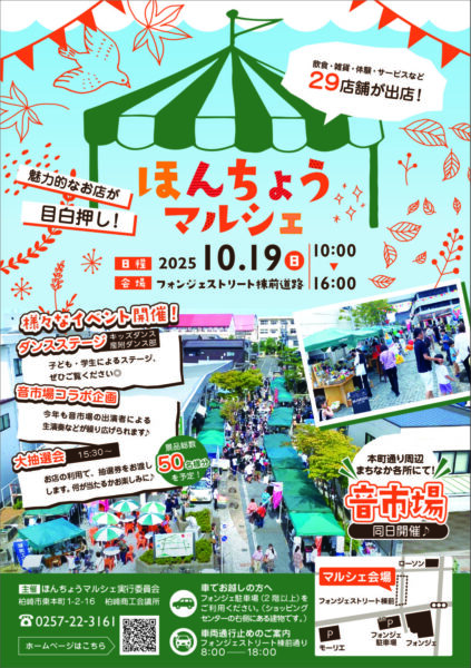 かしわざきほんちょうマルシェ(同実行委員会主催)が19日、柏崎市東本町1のフォンジェストリート棟前道路で開かれる。時間は午前10時~午後4時。(全文311字 10月15日紙面掲載)