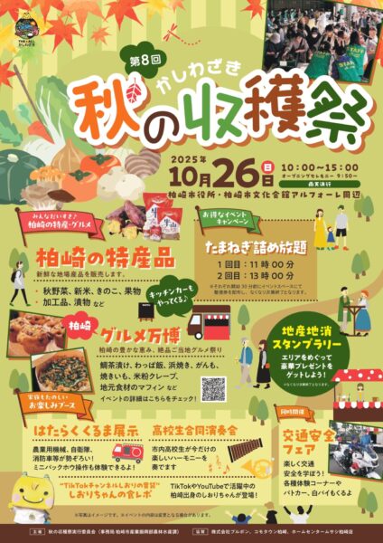 柏崎の豊かな農林水産物やグルメが一堂に集まる「食」の一大イベント「秋の収穫祭」が26日、柏崎市役所や文化会館アルフォーレ周辺で行われる。主催は柏崎市やJAえちご中越など関係機関でつくる実行委員会。市役所前を歩行者天国にして、市内の生産者・加工業者、飲食店など74店が地場産野菜や加工品、飲食物などを販売する。創業塾「社長のたまご塾」のブースもある。