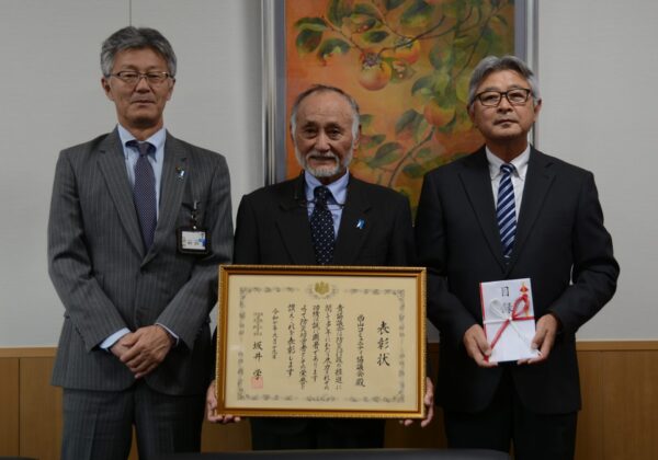 柏崎市の西山コミュニティ協議会(田村謙治会長)が防災功労者として、2025年防災担当大臣表彰を受けた。21日、田村会長と、藤井政明・西山コミュニティセンター長が柏崎市役所を訪れ、地区内24町内会ごとに作成した防災マップを含め、受賞を報告。桜井市長は「皆さんの努力のたまもの」とたたえた。