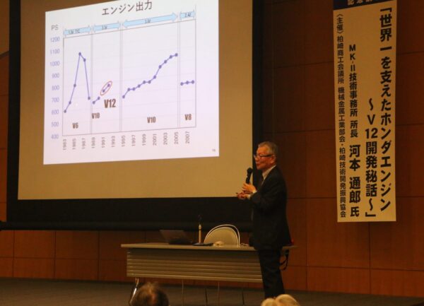 柏崎商工会議所機械金属工業部会と柏崎技術開発振興協会は、柏崎市東本町1の市民プラザで第35回「工業人の集い」を開いた。ホンダのF1エンジン開発を手掛けた河本通郎さんを講師に、「世界一を支えたホンダエンジン~V12開発秘話~」と題した記念講演が行われ、約110人が聴講した。
