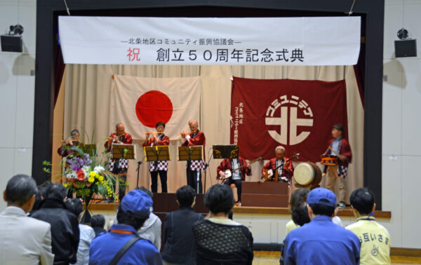 柏崎市の北条地区コミュニティ振興協議会(石橋秀人会長)が19日、創立50周年を祝う記念式典を同地区コミュニティセンターで開いた。節目の年を新たな出発点として地域づくりに努めることを誓った。新型コロナウイルス感染症で約6年間中止していた芸能広場、ふるさと広場での飲食を再開し、にぎわいに包まれた。