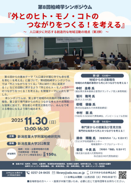 新潟産産業大学付属柏崎研究所(柏崎市軽井川、所長=住吉廣行・同大副学長)が11月30日、第8回柏崎学シンポジウムを同大で開く。テーマは「外とのヒト・モノ・コトのつながりをつくる! を考える~人口減少に対応する創造的な地域活動の視点~」。活動報告、専門家からの提案・意見交換の2部構成で進める。時間は午後1時~4時半。
