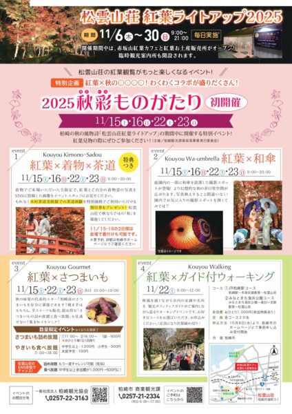 柏崎市の日本庭園「松雲山荘」のライトアップ期間中、柏崎観光誘客促進事業実行委員会が特別イベント「秋彩ものがたり」を繰り広げる。