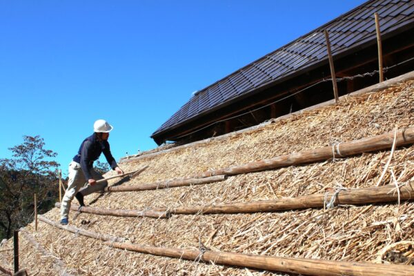 柏崎市高柳町門出にあるかやぶき屋根の古民家を宿泊施設にした「門出かやぶきの里」で、屋根の修復工事が始まった。近年の大雪などで傷みが進んだこともあり、今回14年ぶりに修繕に着手。全国各地から集まった職人が傷んだかやを新しいかやにふき替える作業を進めている。