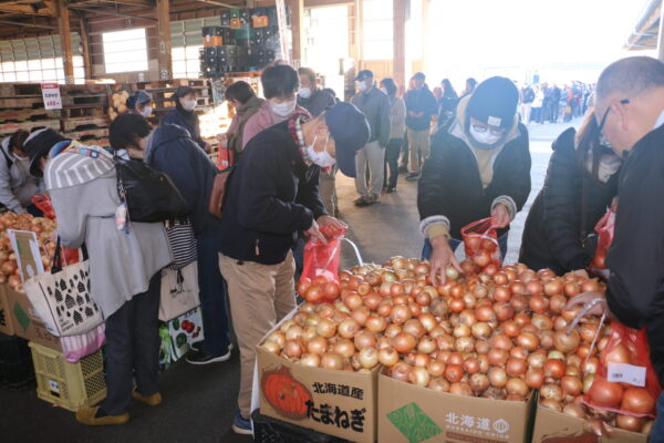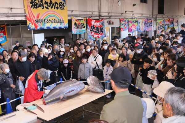 柏崎市半田1の青果市場と魚市場で2年に1度の恒例イベント「やおやまつり・おさかなまつり」(実行委主催)が16日に開かれ、多くの来場者でにぎわった。午前8時の開始前からタマネギやミカンの詰め放題に長い列ができ、会場は活気にあふれた。