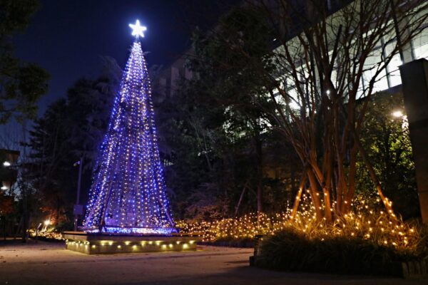 柏崎市の植木組本社遊歩道「Jーフォレスト」に明かり輝く