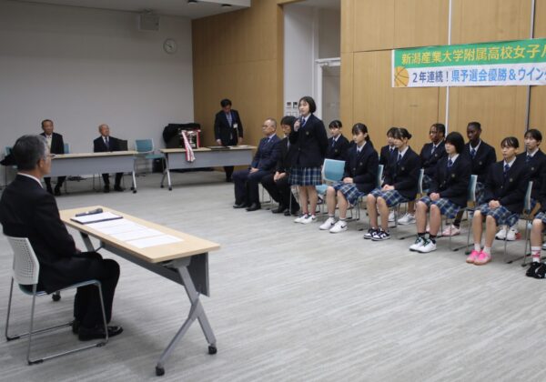 全国高校バスケットボール選手権大会(ウインターカップ)に出場する新潟産業大学附属女子バスケ部が柏崎市役所を訪れ、新潟県予選会での2連覇を報告した。全国大会の目標に「ベスト8」を掲げ、活躍を誓った。