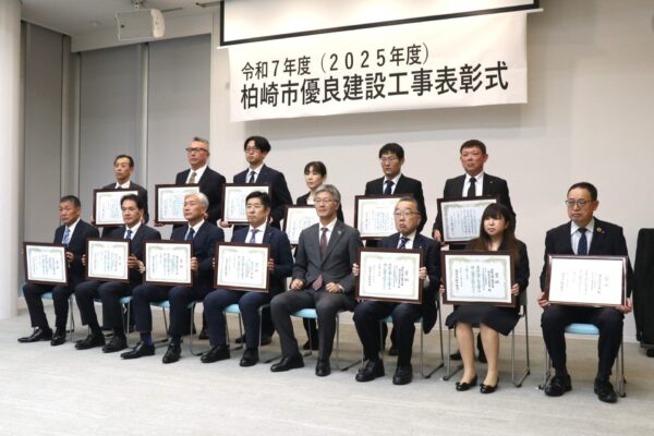 柏崎市の優良建設工事表彰式が柏崎市役所で行われ、5社・1JVによる6工事の優れた技術・安全管理をたたえた。対象は市が発注し、2024年度に完了した工事で、198件の中から選ばれた。桜井雅浩市長が賞状と記念の盾を贈った。