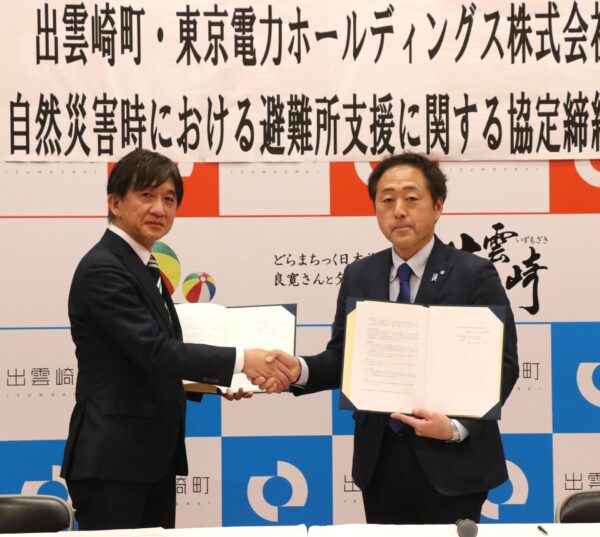 東京電力新潟本社は15日、出雲崎町と自然災害発生時の避難所支援に関する協定を締結した。締結は刈羽村に次ぎ2番目、UPZでは初めて。東電が避難所に仮設トイレやシャワーなどの供給・設置や管理も行う。運用開始は来年1月から。仙海直樹町長は「町の避難訓練にも参加してもらい、万が一の際には迅速に対応してもらいたい」と要望した。(WEB限定)