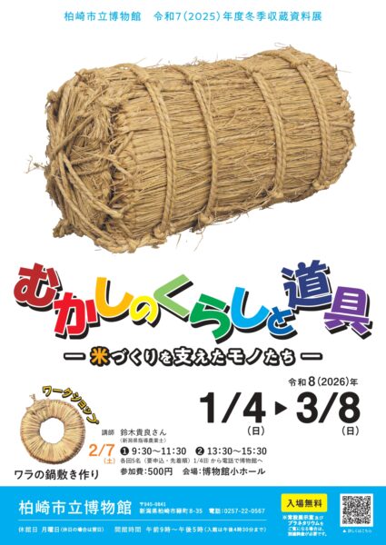 柏崎市立博物館で来年1月4日から、冬季収蔵資料展「むかしのくらしと道具―米づくりを支えたモノたち―」が開かれる。農業の機械化が行われる以前に、長く米づくりを支えてきた昭和前半期以降の道具を紹介する。2月7日には、ワークショップもある。