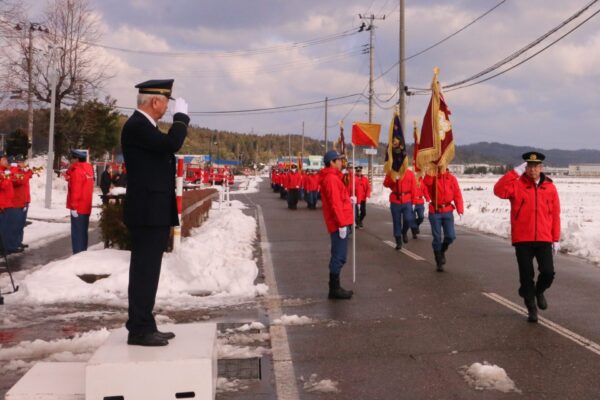 刈羽村消防団(五十嵐栄一団長、団員191人)の出初め式が5日、村生涯学習センター・ラピカで行われた。団員は分列行進を披露したほか、ポンプ積載車15台による村内パレードを実施し、決意を新たにした。