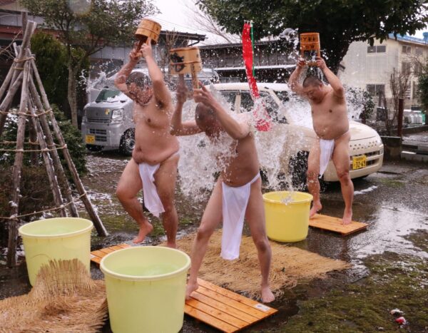 一年で最も寒いとされる二十四節気の「大寒」に当たる20日、柏崎市藤井の日蓮宗・妙覚寺(野口啓隆住職)で、恒例の「寒水荒行」が行われた。気温は1度ほど。雪交じりの冷たい寒風が吹く中、野口住職(52)ら僧侶3人が冷水を頭からかぶり、世界平和や檀(だん)信徒の健康を祈った。