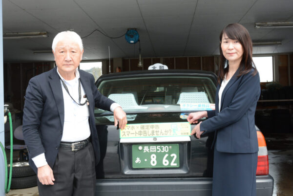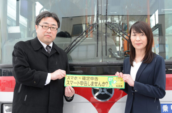 16日から始まる所得税等の確定申告を前に、柏崎税務署(金髙吏佐子署長)は「スマホ確定申告」のPRステッカーを越後交通柏崎営業所(柏崎市扇町、田辺健太郎所長)、大和タクシー(柏崎市茨目3、元井春夫社長)、柏崎自動車学校(柏崎市茨目1、山岸弘幸社長)へ交付した。スマホ申告のメリットを活用し、さらなる普及に協力を求めた。