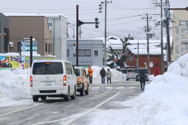 柏崎市がまとめた市内降積雪観測点8カ所の記録によると、昨年12月から今年1月までの降雪量は、近年では災害救助法が適用された2020年度に次ぐ大雪となった。1月下旬からの長期寒波が断続的に雪を降らせ、2月上旬には全観測点で今冬最大の積雪深を記録。アメダス(柏崎市元城町)によると市街地では平年の4倍超に達した。雪が解けないまま積み重なり、市民は連日の除雪に追われ、人的被害も発生した。