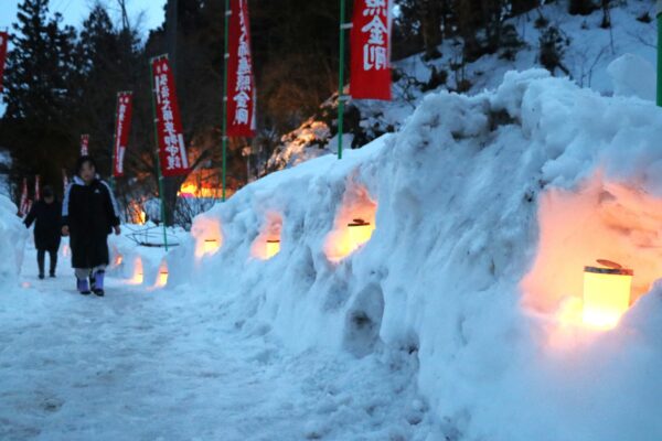 柏崎市西長鳥の岩之入地区で14日、伝統行事「弘法大師堂霊塩水祭礼・百八灯祭」が行われた。市内では数少ない冬季の伝統行事。昨年は当日の大雪で中止し、2年ぶりの開催。集落内約450mに並んだ約500本のろうそくの明かりが辺りを包み、地域内外から訪れた人を魅了した。