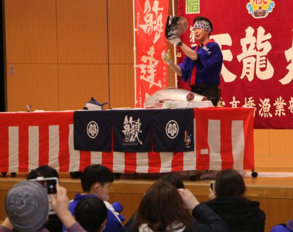 刈羽村ラピカで絵本展にちなみ マグロの解体ショー