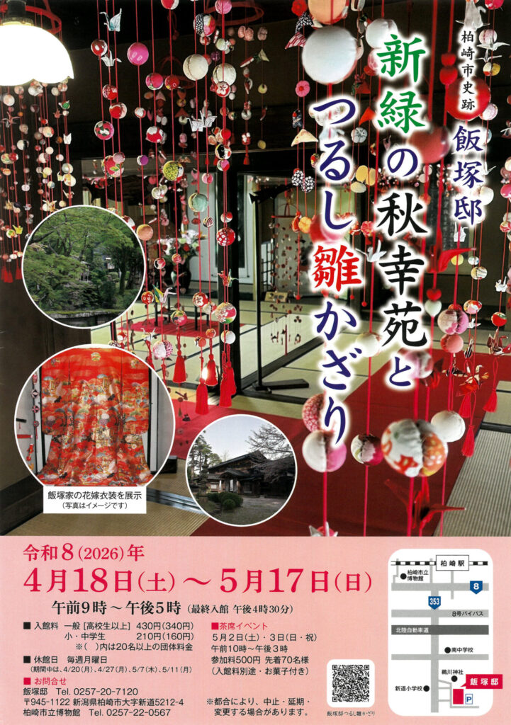 柏崎市新道、史跡・飯塚邸で18日から、「新緑の秋幸苑(しゅうこうえん)とつるし雛(ひな)かざり」が開かれる。主催は柏崎市教育委員会。会期は5月17日まで。期間中、茶席イベントもある。