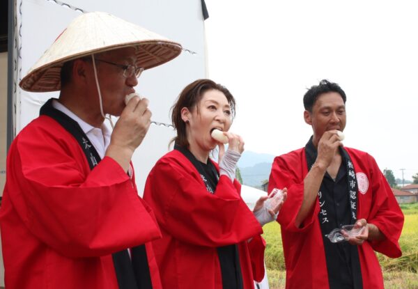 柏崎市の認証米「米山プリンセス」 初の早植え実証実験で早くも収穫 越乃リュウさんも稲刈り