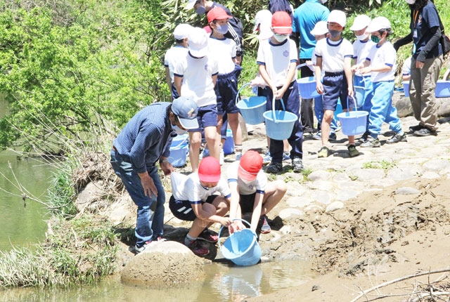 鯖石川にサクラマスの稚魚を放流する小学生=6日午前、市内高柳町岡野町