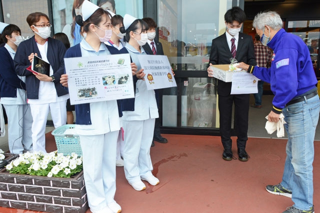 シトラスリボンを来店者に配る看護学校の学生=7日午後、市内岩上の原信岩上店