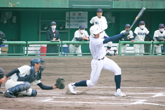 産附―新潟。産附は初回1死一・二塁、鈴木の中前適時打で1―0に=11日午前、長岡市の悠久山球場