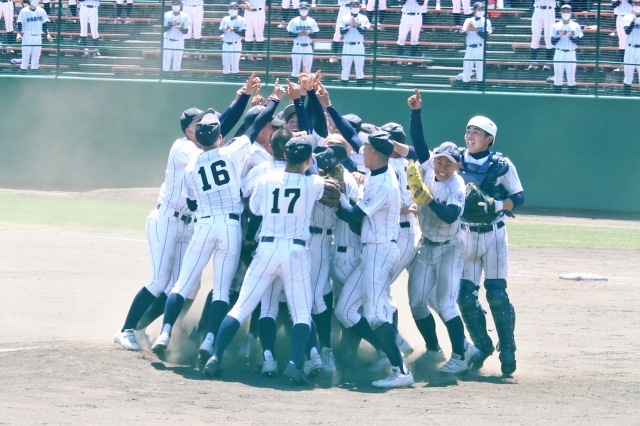 初優勝が決まり、マウンド付近で人さし指を突き上げ、喜びを分かち合う産附の選手たち=13日、長岡市の悠久山球場 (2021/05/13)