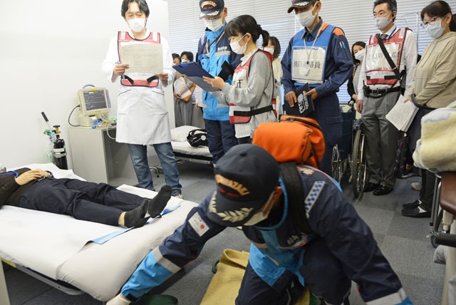 高齢者の新型ウイルスワクチン集団接種を前に行われた第2回模擬訓練。アナフィラキシーショックへの対応も確認した=13日、市役所旧庁舎