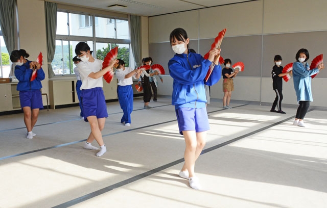 今年の綾子舞伝承学習を開始した新道小、南中の児童生徒。11月の発表会を目指す=14日、南中