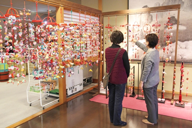 ロビーを彩るつるし飾り。ファンの人たちの手作りだ=市内高柳町、じょんのび村 (2021/04/23)
