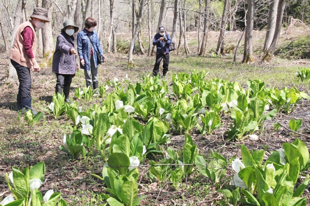 見頃を迎えた「ハンノキ林に咲くミズバショウ」の群生=22日、市内鵜川・餅粮集落跡 (2021/04/24)