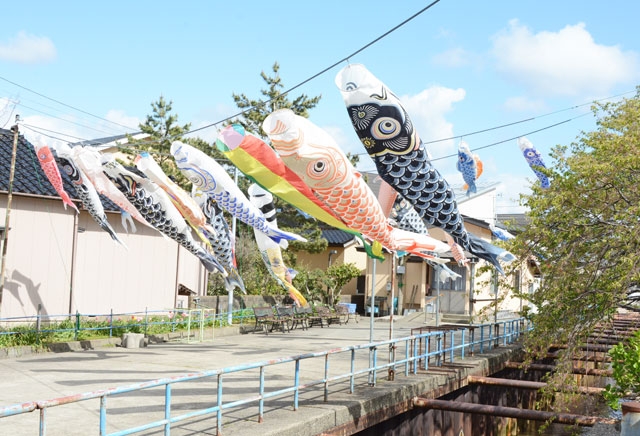 葉桜と“共演”し、よしやぶ川の上を泳ぐこいのぼり=26日、市内松美町地内 (2021/04/27)