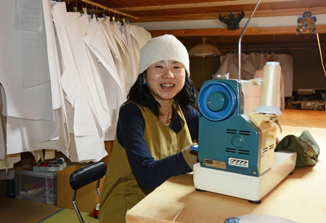 縁あって暮らし、4年の佐藤さん。展示会に向け、得意のミシンを掛ける=市内高柳町荻ノ島 (2021/04/28)
