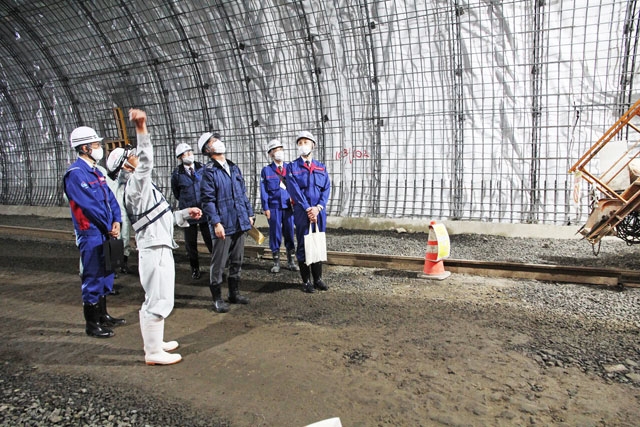 国道8号バイパス「仮称・柏崎トンネル」工事を視察し、説明を受ける桜井市長(中央) (2021/04/30)