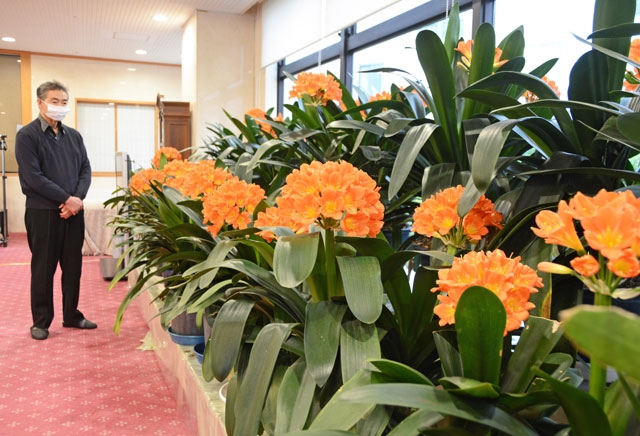見頃となったクンシラン。緑の葉とオレンジ色の花のコントラストが美しい=30日、市内鯨波、メトロポリタン松島 (2021/05/01)