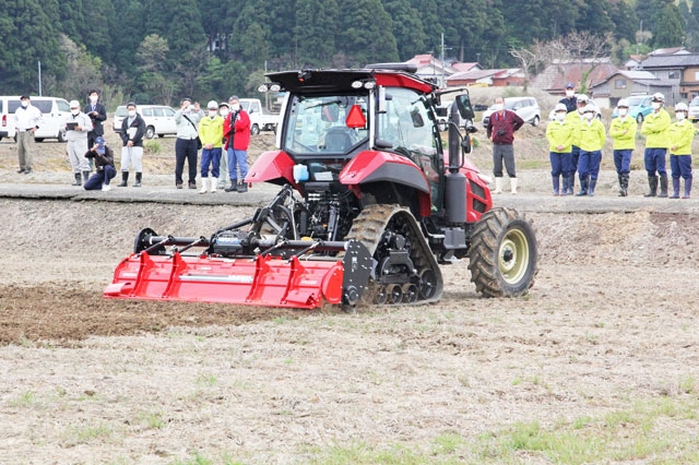 山波社長、桜井市長らが見守る中、ほ場の土を耕すロボットトラクター=市内水上 (2021/05/06)