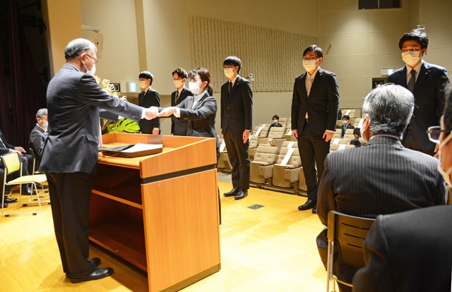 厳粛な雰囲気に包まれながら、入社式で植木社長(左)から辞令交付を受ける新入社員=1日、柏崎エネルギーホール (2021/04/01)