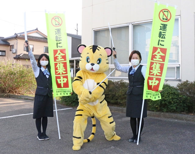 運動期間中、ドライバーらに「ながら運転禁止」を呼び掛けるのぼり旗 (2021/04/05)