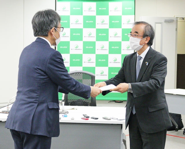 原子力規制庁の荻野長官(左)に東京電力柏崎刈羽原発に関する要望書を手渡す花角知事=5日午後、東京都港区 (2021/04/06)