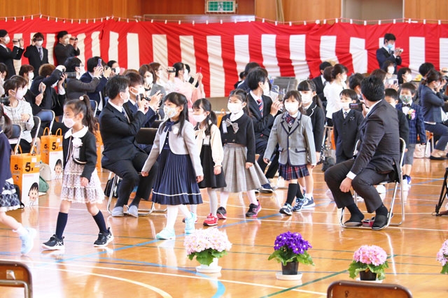 マスク姿で入場する新1年生。温かな日差しを浴びながら、学校生活の一歩を踏み出した=7日午前、剣野小 (2021/04/07)