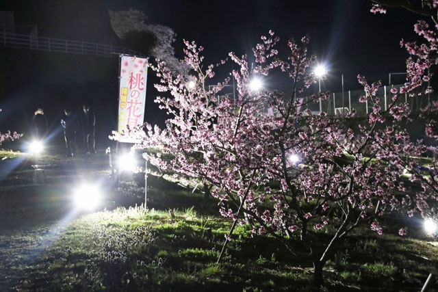 ライトアップされた桃の花=7日午後7時ごろ、ぴあパークとうりんぼ (2021/04/08)