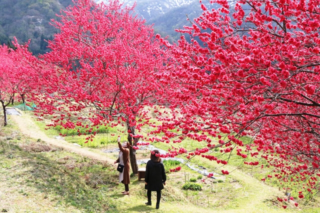 ハナモモの花などに彩られた里山を楽しむ人たち=市内谷根 (2021/04/10)