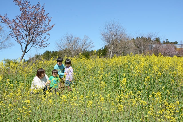 七分咲きとなり、黄色の帯ができた原っぱエリアの菜の花=11日、夢の森公園 (2021/04/12)