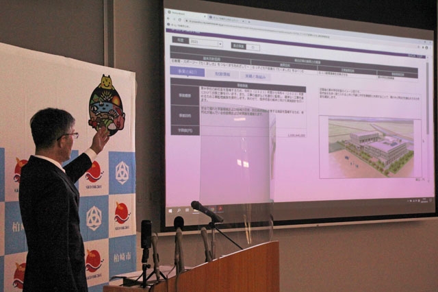 デジタル予算書を投影しながら、市の新年度当初予算案を発表する桜井市長=12日、市役所多目的室