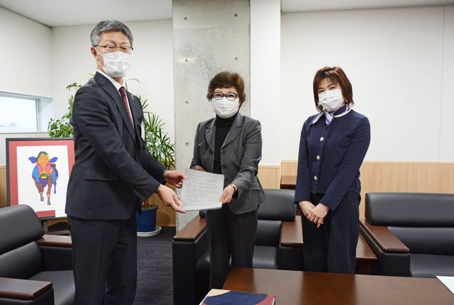 次期「市男女共同参画基本計画」を桜井市長に答申した新野会長(中央)、上野副会長=市役所市長応接室