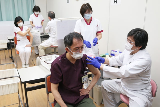 本県でも始まった新型コロナウイルス感染症のワクチン接種。県内トップを切り、国立病院機構新潟病院では医師ら24人が接種を受けた=19日午前、市内赤坂町の新潟病院